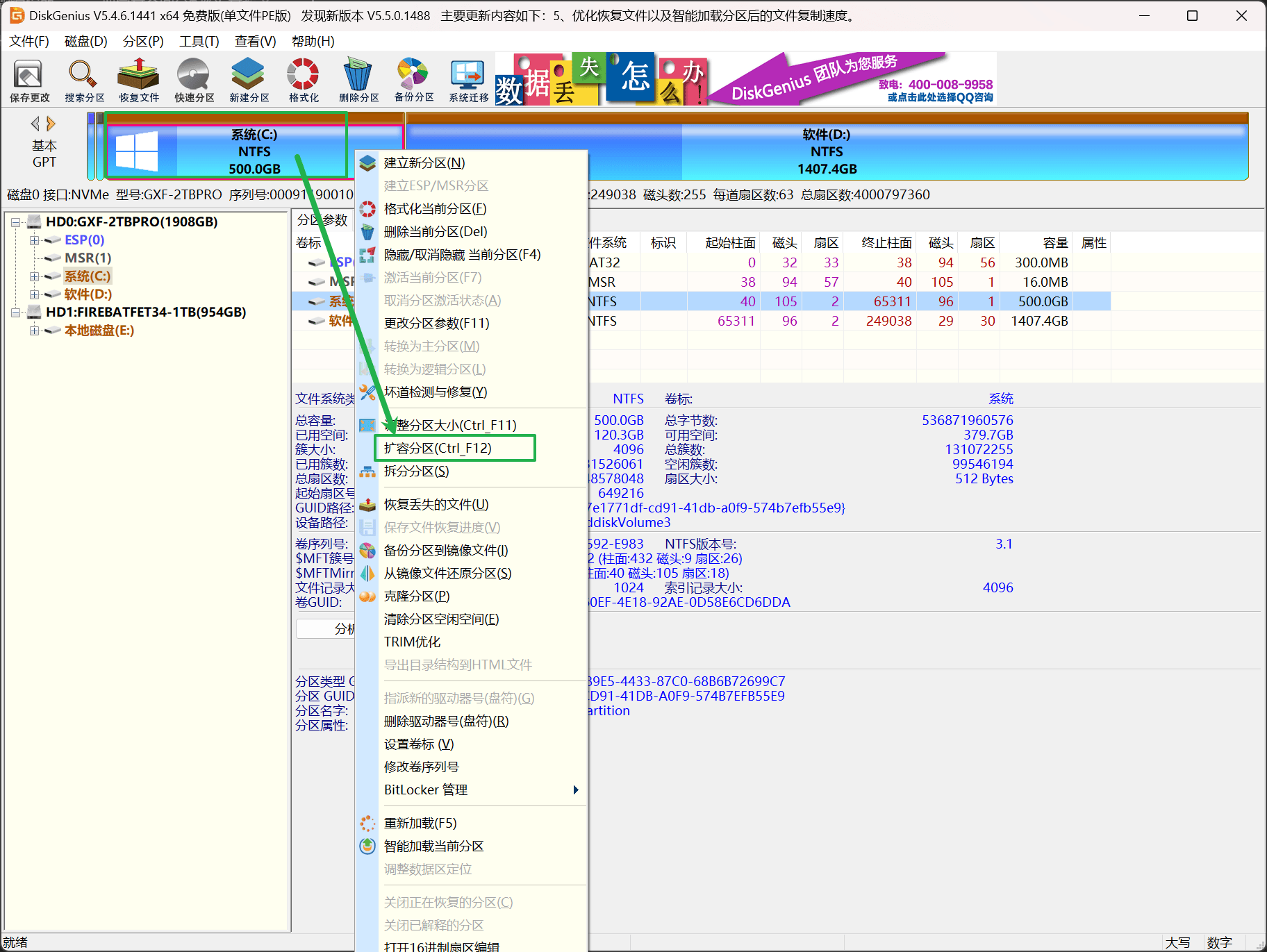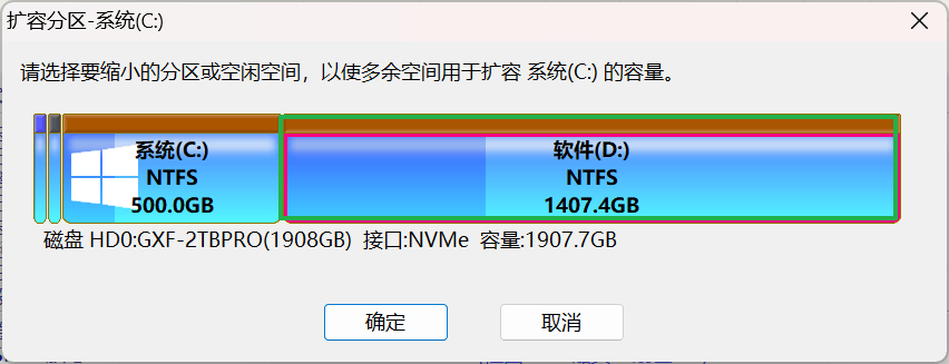 只有是同一块硬盘的才能进行扩容,例如:我装了A、B两块硬盘,我把A硬盘分成了C、D盘,B硬盘分为了E盘。这时只能把D分给C,不能把E分给C。
