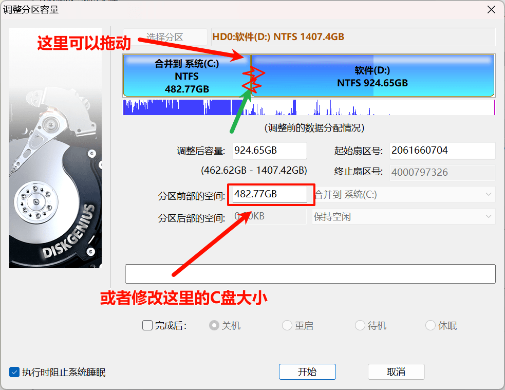 从图中可以看到我的C和D是同一块硬盘,所以只能把D分给C。