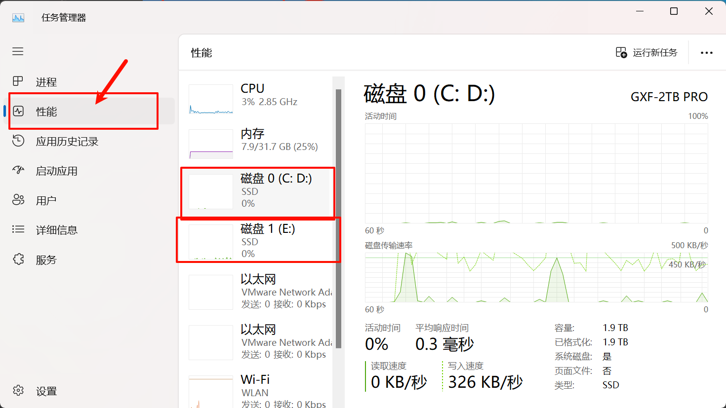 Ctrl+Shift+Esc打开任务管理器-性能-磁盘